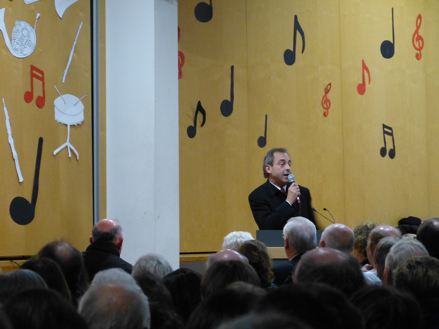 Als die Fragezeichen aus den Gesichtern der Zuhörer verschwunden waren, konnte unser Moderator, Dr. Frank Wernecke, das Mikrofon übernehmen und in seiner gewohnt lässig-lustigen Art die nun folgenden Stücke anmoderieren. Das Motto des Abends lautete: „ musikalische Weltreise“ und so nahmen die Wulfener das Publikum mit auf die Reise nach Sizilien mit dem Stück „Intermezzo Sinfonica“, über das feurige Spanien mit „Espanol Cani“ von P.M. . Ruhig ging es weiter mit dem Monkee’s Hit „I’m a believer“, bevor sie die erste Konzerthälfte mit „Highland Cathedral“ von U. Roever / M. Korb eindrucksvoll beendeten.